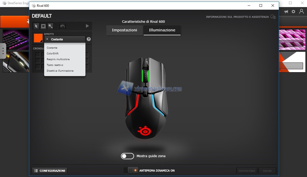 In ‘’Attrezzattura’’ visualizzerete tutte le periferiche SteelSeries compatibili con il software. In questo caso abbiamo collegato la tastiera SteelSeries Apex M750 TKL e ovviamente il mouse SteelSeries Rival 600. Facendo doppio click sul rettangolo relativo la periferica si aprirà una seconda finestra nella quale avremo un’immagine del mouse, in questo caso, contornata da ulteriori voci e Menù che ci daranno la possibilità di personalizzare non solo l’illuminazione RGB per singolo tasto ma anche di assegnare e personalizzare i tasti del mouse con funzioni nuove o Macro grazie anche all’Editor a lato sinistro o ancora modificare il Polling Rate e la voce più importante modificare il valore di LOD (Distanza di tracciamento).